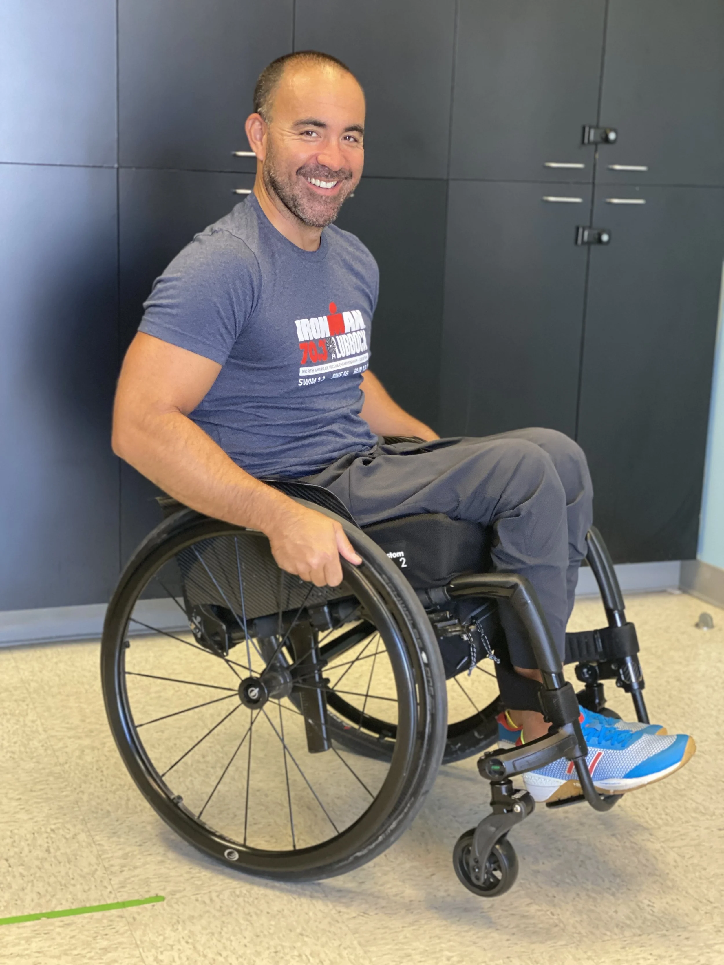 A smiling man in a gray marathon t-shirt sitting in a wheelchair, posing indoors against a black wall with cabinet doors.