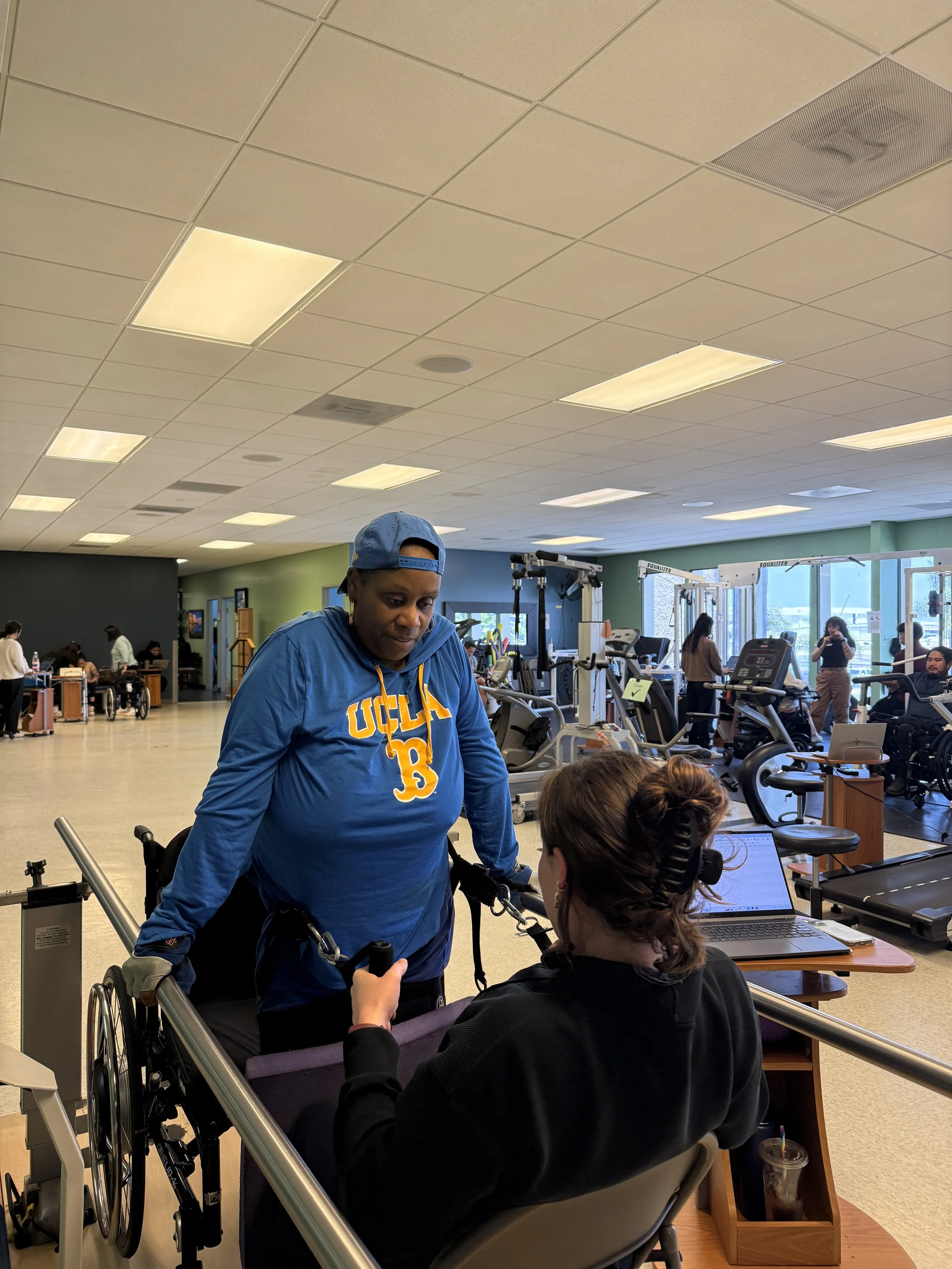 A woman in a UCLA hoodie being assisted by a staff member in a wheelchair inside a rehabilitation or fitness center with exercise equipment and other people in the background.